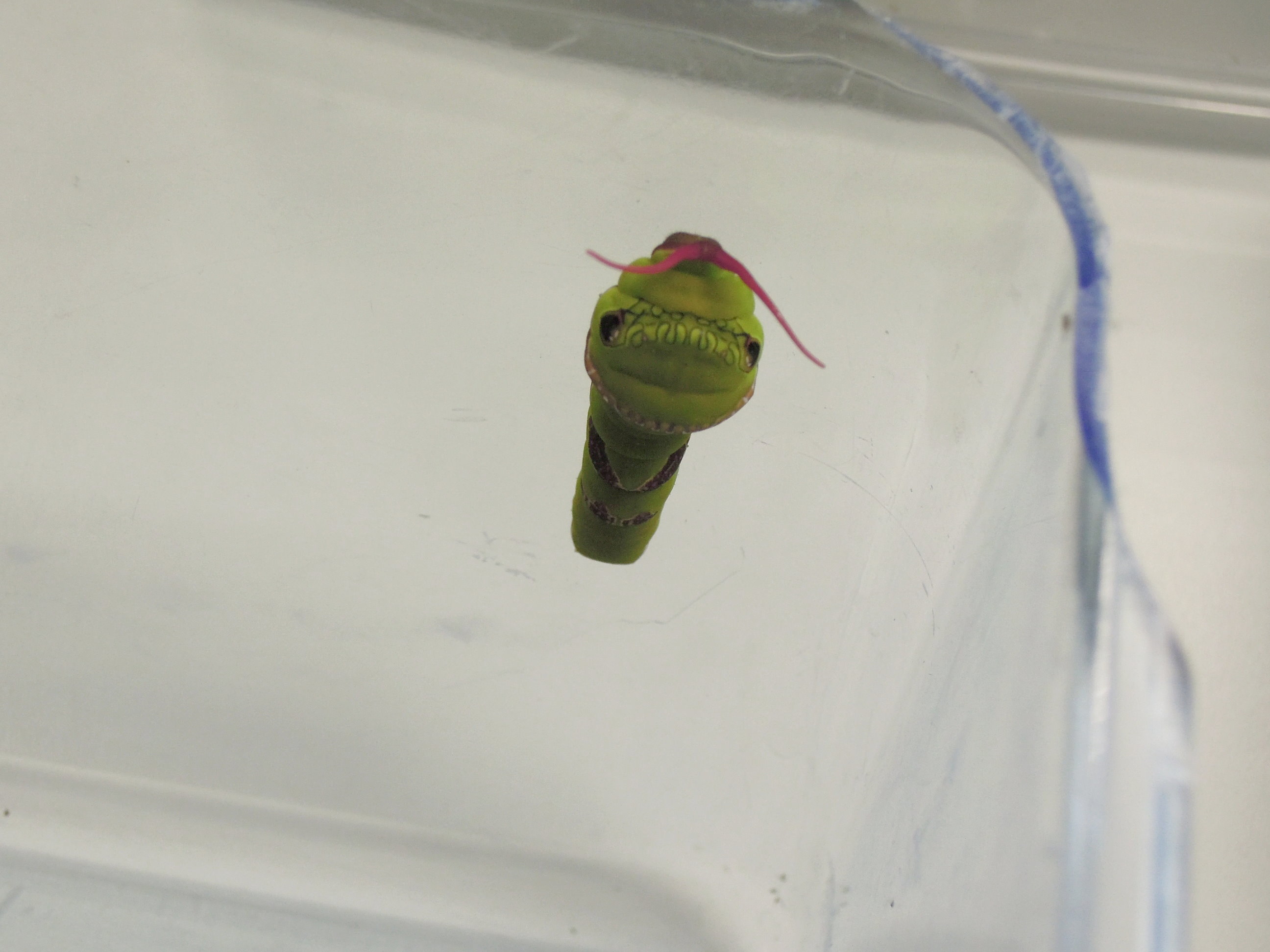 我們終齡幼蟲階段時,全身綠色,並有數條黑色帶;假頭和假眼附近有