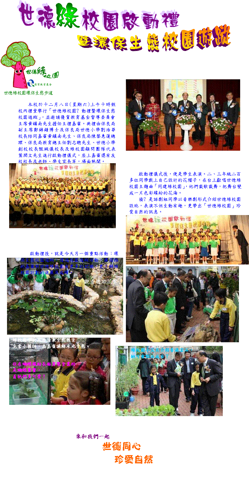 為加強學生對愛護生態及環境的意識,保良局世德小學成功申請優質教育基金撥款,締造「世德綠校園」。